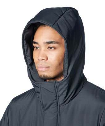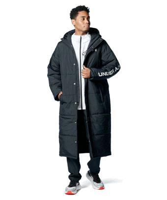 ベンチにいるときも暖かく。軽量な中綿、袖口には雨風の侵入を防ぐサムホールのついた「コールドギア」を採用し、撥水機能も搭載。フード付きで冬場のスポーツ観戦にもおすすめ。