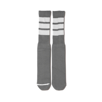 F 子供からモンスターまで誰でも履けるという触れ込みのソックス。オールドスクールなカラーリングと、足のサイズによって長さが変わるという一風変わった形が特徴。つま先にラインを配置し、表裏がわかりやすいデザインになっている。